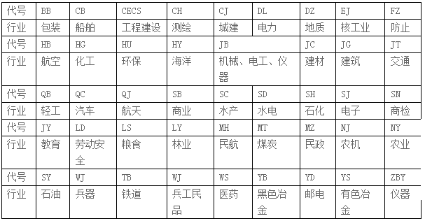 ?、谛袠I(yè)標(biāo)準(zhǔn) 行業(yè)標(biāo)準(zhǔn)用各行各業(yè)名稱的漢語拼音縮寫表示,部分行業(yè)的標(biāo)準(zhǔn)代號見下表: